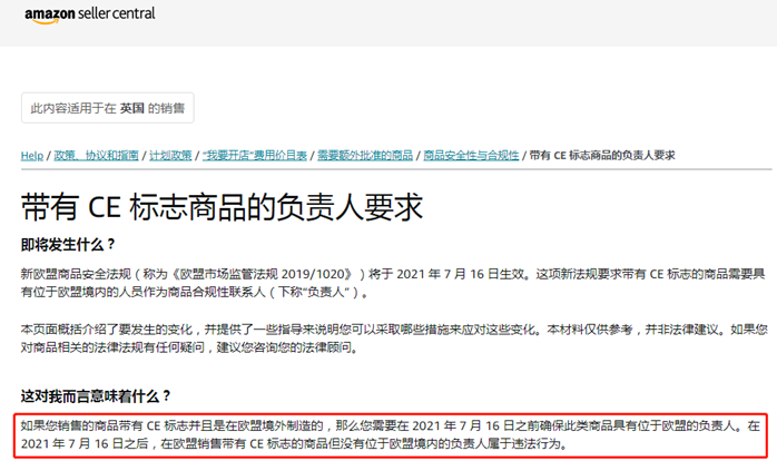 eu의 새로운 상품안전규정 (market regulation 2019/1020)은 ce 마크를 부착한 모든 상품에 대하여 eu 지역 (영국 제외)에 있는 자연인 또는 법인이 상품적합담당자로 있어야 한다고 규정하고 있다.의료 기구, 삭도 장치, 민간 폭발물, 온수 보일러 및 엘리베이터를 제외한 모든 ce 표시 상품은이 법의 적용을 받는다 (영국 내에서 판매되는 상품은이 법의 적용을 받지 않는다).이 규정은 2021년 7월 16일부터 시행될 예정이다.2021년 7월 16일까지 ce 마크가 있는 제품에 해당 연락처의 연락처가 붙어있는지 확인하십시오.이러한 라벨은 상품, 상품의 포장, 소포 또는 부록 서류에 붙일 수 있다.그렇지 않으면 위법행위로 간주된다.eu의 책임자는 eu 내의 제조업체, 브랜드 또는 수입자가 될 수 있으며, eu 내의 공인 대표자가 될 수 있다.